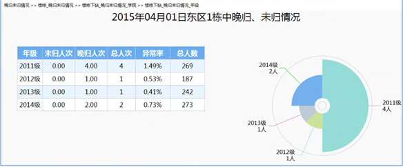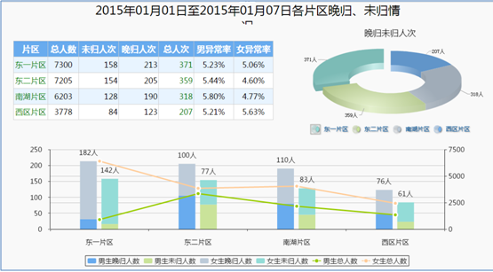 通過時間參數(shù)段內(nèi)的未歸人次、晚歸人次、男女異常率指標(biāo)展示。
