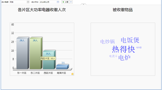 該部分內(nèi)容主要以圖形顯示,是柱狀圖和詞云圖的結(jié)合體。鉆取到最細(xì)力度是學(xué)生未歸電器收繳明細(xì)列表,包括學(xué)生的基本信息以及收繳的電器和收繳時間。