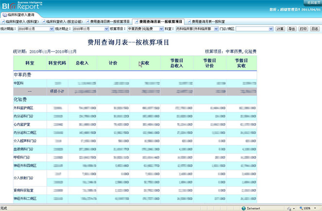 收入的查詢還可以分科室按照核算項目進行查詢,如下圖: