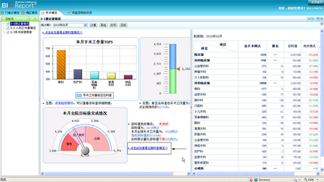 對于手工工作量我們通過按照科室進行排名,并將全院手術目標完成情況通過儀表盤的方式進行展現,通過指針指向能夠快速了解手術指標完成情況。
